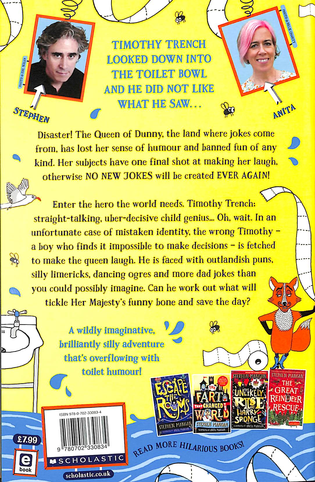Her subjects have one final shot at making her laugh otherwise NO NEW JOKES will be created EVER AGAIN! Enter the hero the world needs. Timothy Trench: straight-talking, uber-decisive child genius... oh, wait. In an unfortunate case of mistaken identity, the wrong Timothy - a boy who finds it impossible to make decisions - is fetched to make the Queen laugh. Can he work out what will tickle Her Majesty's funny bone and save the day? A wildly imaginative, brilliantly silly adventure that's overflowing with toilet humour! Wildly funny, delightfully imaginative storytelling with a message that any kid can be a hero! Packed with pictures by Stephen Mangan's sister Anita Mangan. Escape the Rooms, The Fart That Changed the World and The Great Reindeer Rescue have been huge bestsellers: Stephen and Anita are comic dynamite.   Praise for Stephen and Anita's books: Escape the Rooms: "A brilliant, clever, kind of genius book" Graham Norton, Virgin Radio 'Richly imagined and deeply heartfelt' Hadley Freeman, Guardian 'Manages to feel both classic and modern at the same time' Good Housekeeping 'A beautiful and exciting adventure that ignites the imagination' Edith Bowman   The Fart That Changed the World "A sure-fire way for kids to entertain themselves.