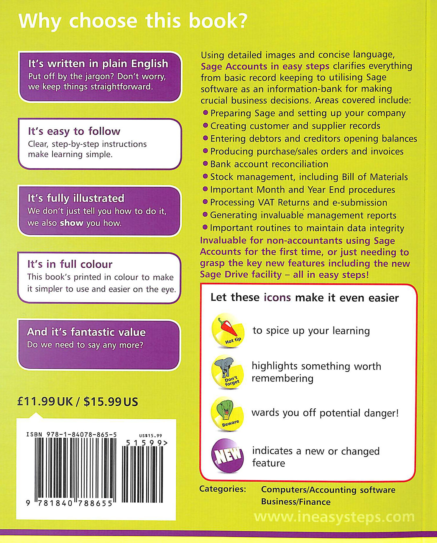 This definitive guide clarifies everything from basic recording keeping to utilising Sage as an information-bank for making crucial business decisions. Areas covered include: Setting up Sage, entering debtors and creditors Producing purchase/sales orders and invoices Bank account reconciliation Stock management, including Bill of Materials Important month and year end procedures Processing the VAT return and e-Submission Generating invaluable management reports Sage Accounts in easy steps is ideal for non-accountants using Sage for the first time, or just needing to grasp the new key features all in easy steps!Illustrated using Sage 50cloud Accounts