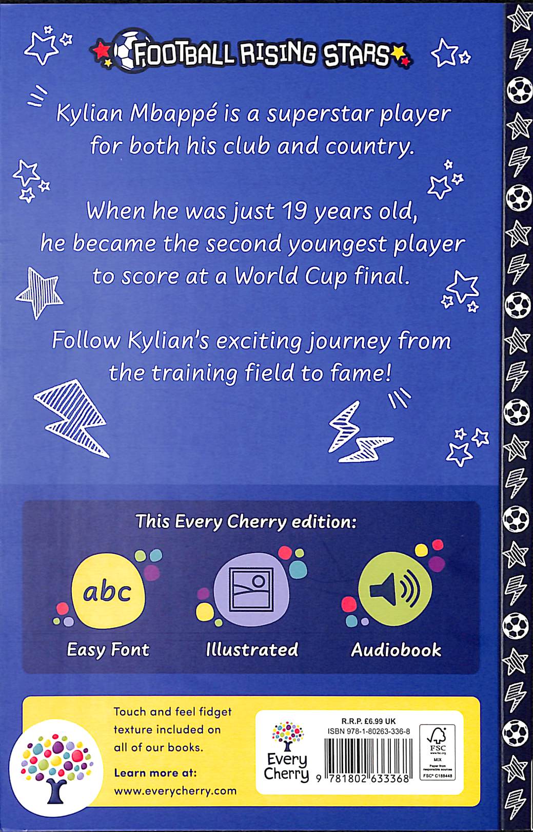 An adapted, illustrated and accessible edition of Kylian Mbappé’s football journey. Enjoy Every Cherry’s new adaptation of Football Rising Stars’ Kylian Mbappé featuring illustrations, sensory components and glossary descriptions to accompany the text to aid in reading comprehension and accessibility.