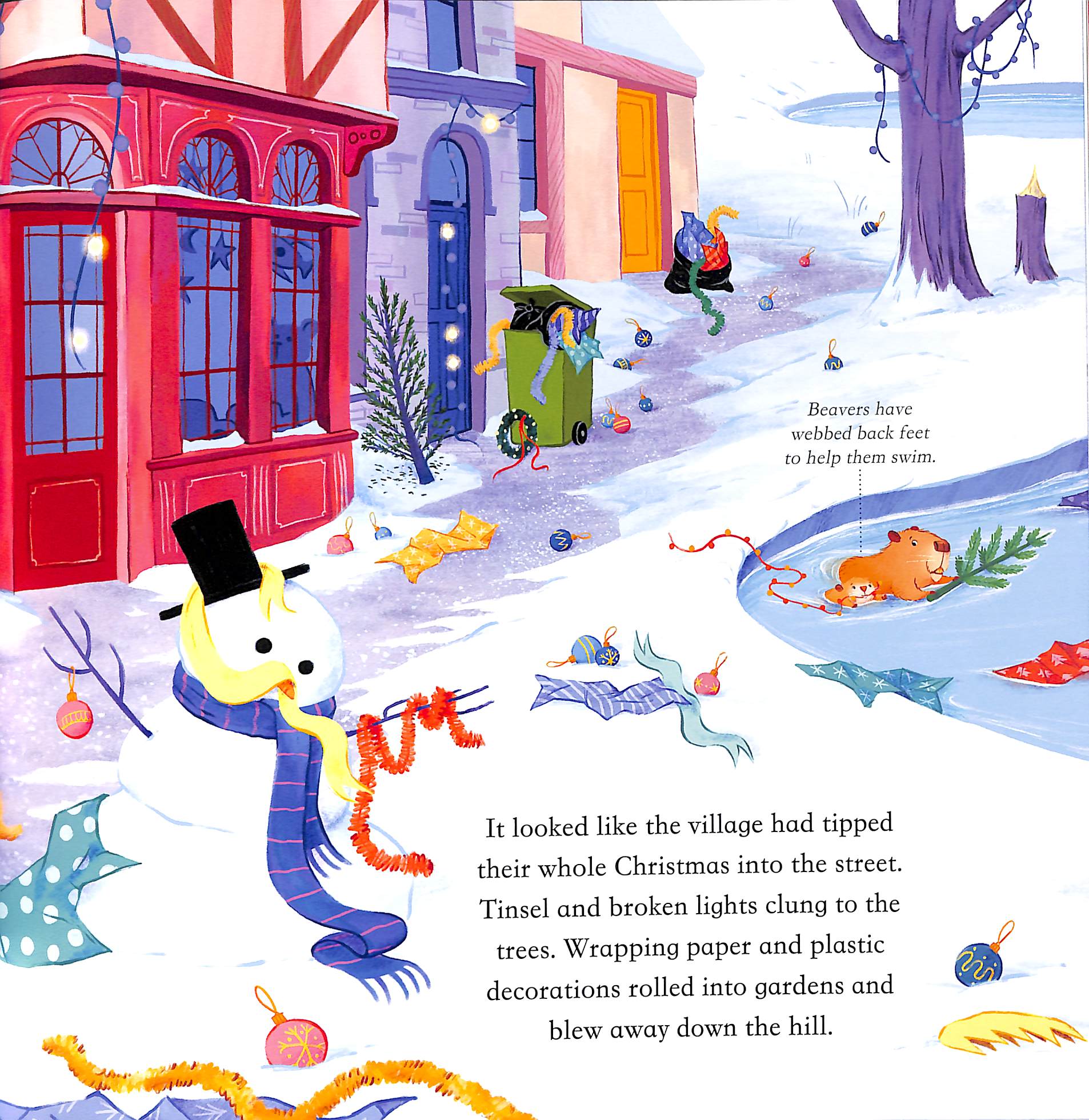 But tinsel and broken lights cling to trees, and wrapping paper and plastic decorations have rolled into gardens and blown away down the hill, and a baby beaver gets trapped in the lights.