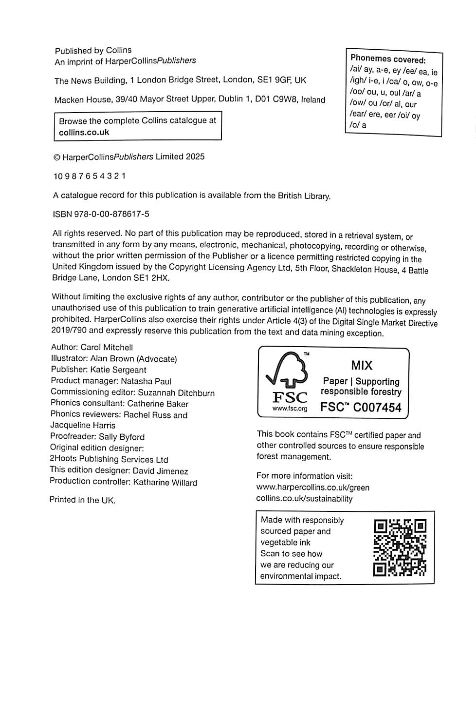 The twins track down the thief and uncover their identity to save the show. This is a comical graphic novel. The focus sounds covered are: /ai/ ay, a-e, ey /ee/ ea, ie /igh/ i-e, i /oa/ o, ow, o-e /oo/ ou, u, oul /ar/ a /ow/ ou /or/ al, our /ear/ ere, eer /oi/ oy /o/ a. Free teacher notes for this book are provided on collins.co.uk which will help to develop comprehension skills, vocabulary acquisition and recall – leading to reading success
