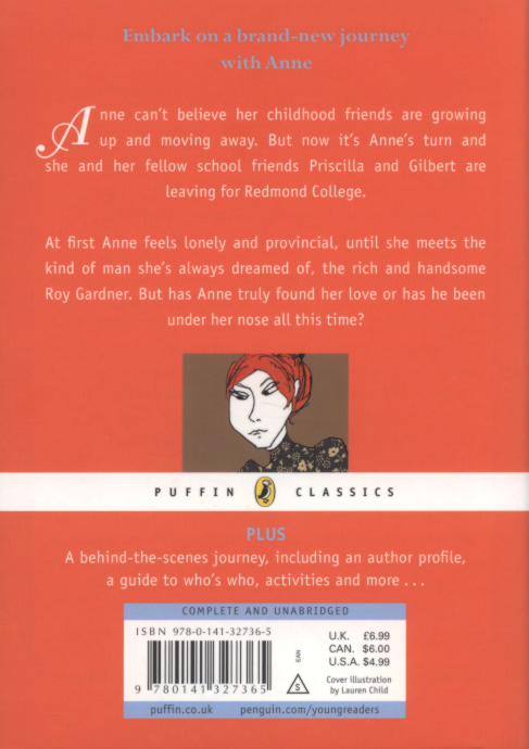 But Anne soon makes new friends, one of whom is rich, handsome Roy Gardner, whose attentions to Anne make Gilbert very jealous... The book includes a behind-the-scenes journey, including an author profile, a guide to who's who, activities and more.. The Puffin Classics relaunch includes:A Little PrincessAlice's Adventures in WonderlandAlice's Adventures Through the Looking GlassAnne of Green Gables seriesBlack BeautyHans Andersen's Fairy TalesHeidiJourney to the Centre of the EarthLittle WomenPeter PanTales of the Greek HeroesThe Adventures of Huckleberry FinnThe Adventures of King ArthurThe Adventures of Tom SawyerThe Call of the WildThe Jungle BookThe OdysseyThe Secret GardenThe Wind in the WillowsThe Wizard of OzTreasure Island
