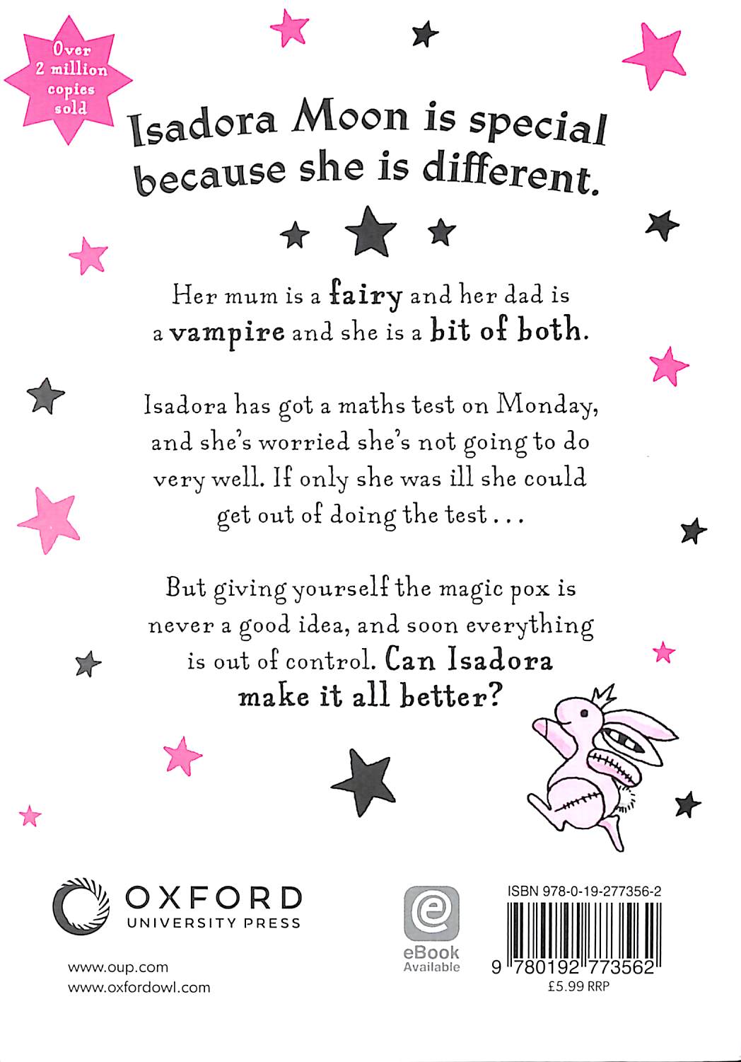 Isadora Moon is special because she's different. Her mum is a fairy, her dad is a vampire, and she's a bit of both. When Isadora's teacher announces the class are having a maths test on Monday, Isadora gets a nervous feeling in her tummy.