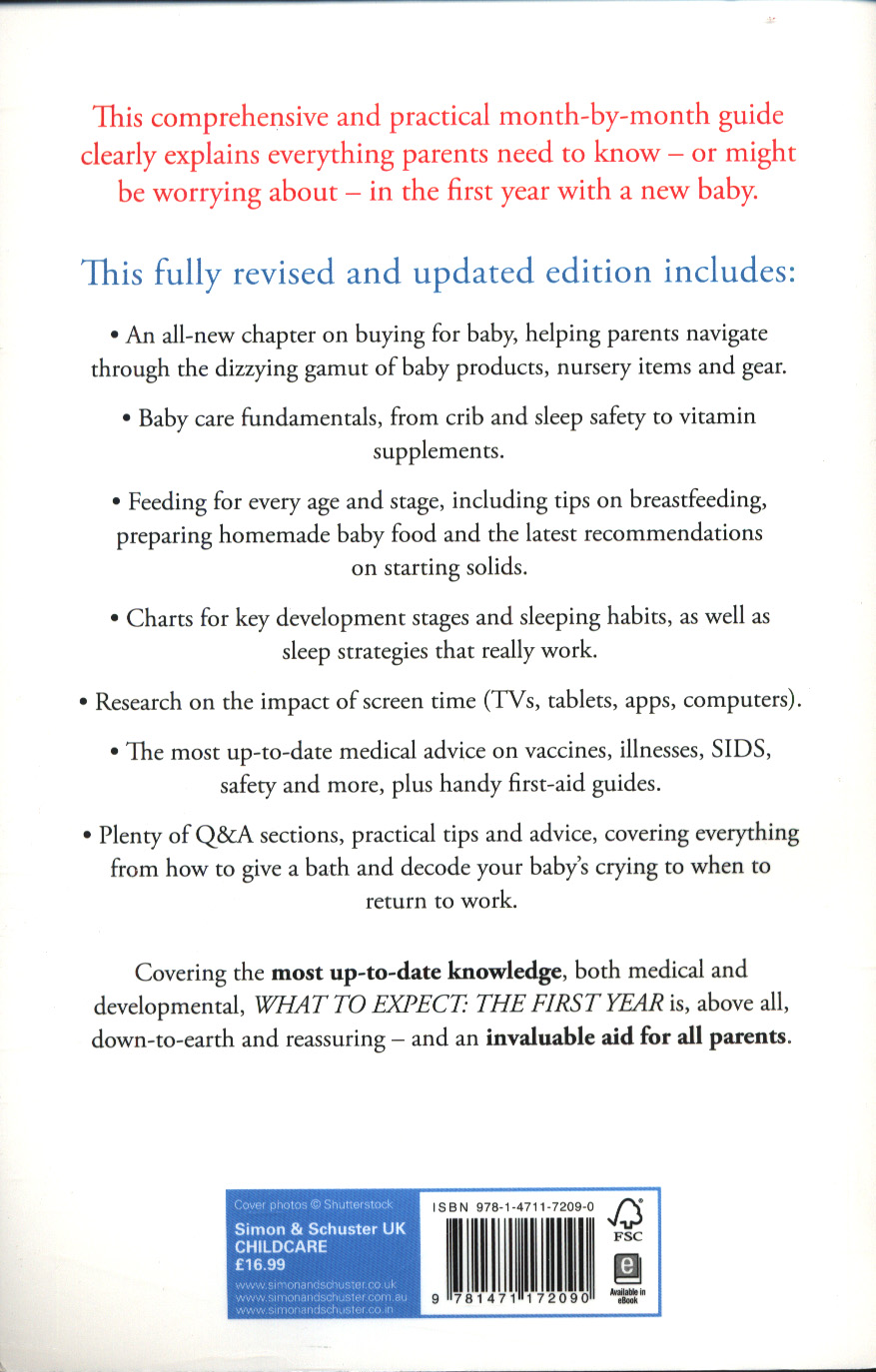 FROM THE AUTHOR OF THE BESTSELLING WHAT TO EXPECT SERIES, 40 MILLION COPIES SOLD WORLDWIDE. FULLY REVISED AND UPDATED THROUGHOUT. This comprehensive and practical month-by-month guide clearly explains everything parents need to know – or might be worrying about – in the first year with a new baby.  Including:-All-new chapter on buying for baby; helping parents navigate through the dizzying gamut of baby products, nursery items and gear. Baby care fundamentals, from crib and sleep safety to vitamin supplements. Feeding for every age and stage, including tips on breastfeeding, preparing homemade baby food and the latest recommendations on starting solids. Charts for key development stages and sleeping habits, as well as sleep strategies that really work. Research on the impact of screen time (TVs, tablets, apps, computers). The most up-to-date medical advice on vaccines, illnesses, SIDS, safety, and more, plus handy first-aid guides. Dozens of Q&A sections, practical tips and advice that focus on advice for parents and their baby, covering everything from how to give a bath and decode your baby's crying to when to return to work. This is the only book on infant care to address both the physical and emotional needs of the whole family.