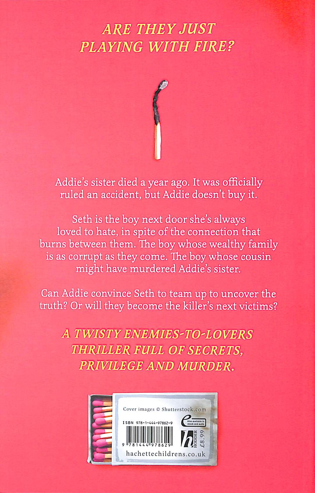 This enemies-to-lovers thriller is packed with secrets, privilege and murder and will keep you guessing until the last page. Which will ignite first: her rage, their desire or a killer's bloodlust?When eighteen-year-old Addie's sister is found dead at the bottom of a ravine it's officially ruled an accident, but Addie doesn't buy it.