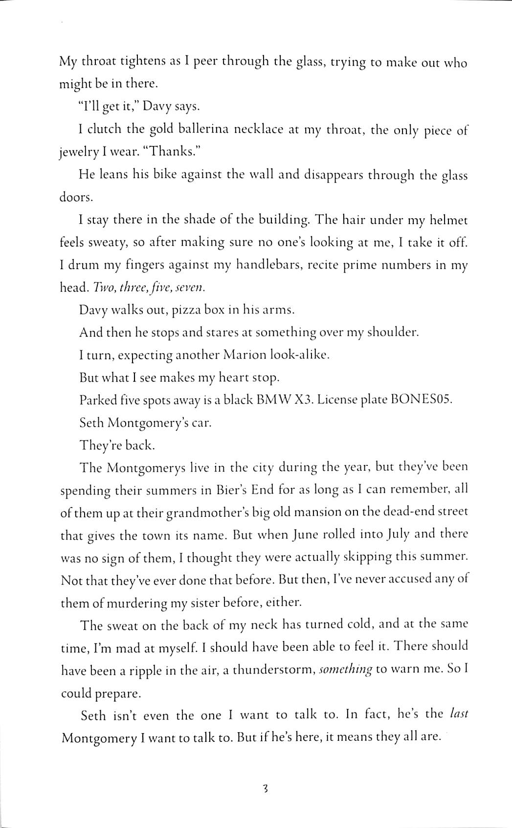 The problem is, Addie has no evidence because when her sister died, she was a little distracted with Seth Montgomery, the boy next door Addie's always loved to hate. She believes the murderer is Thatcher Montgomery, Seth's cousin.