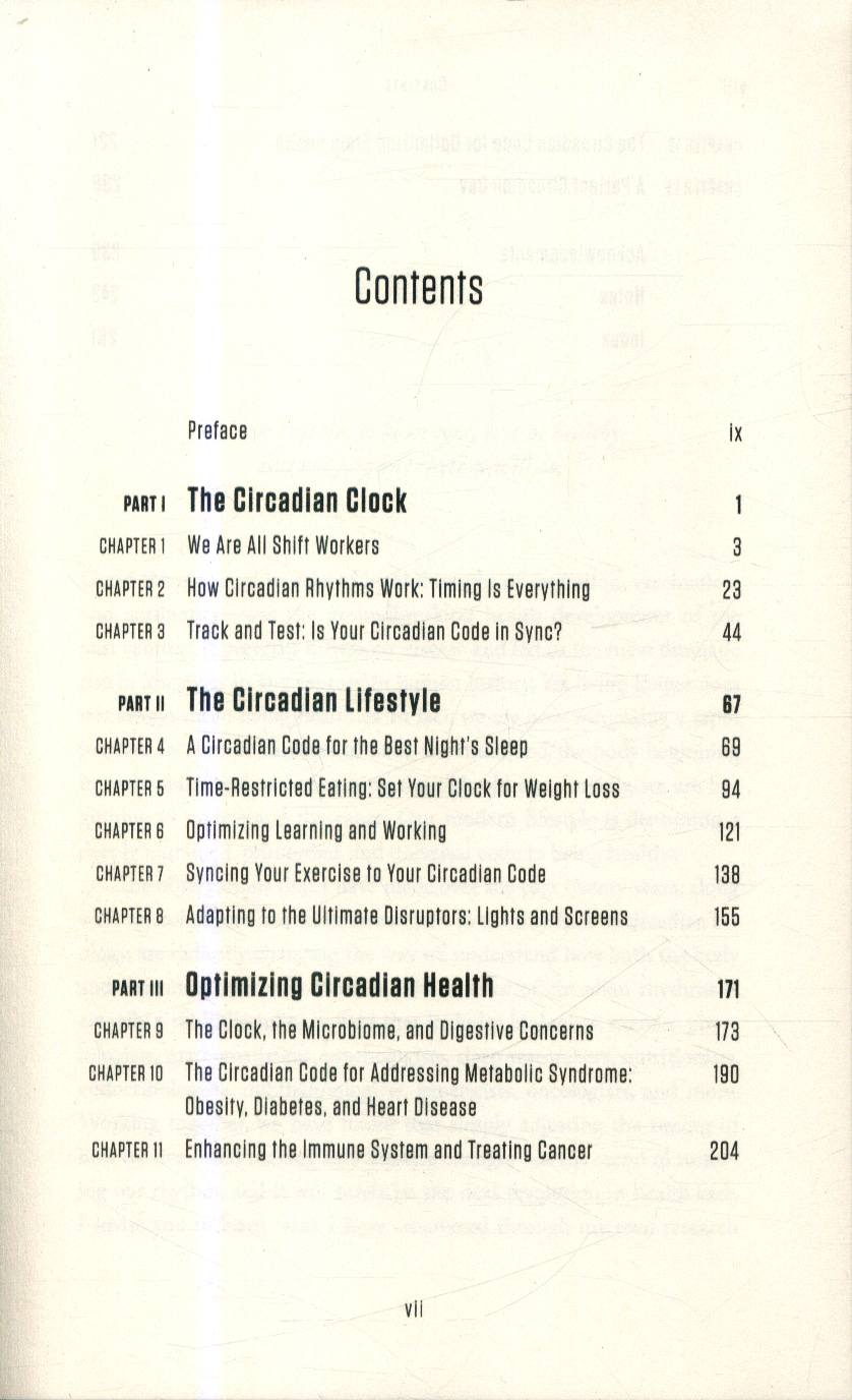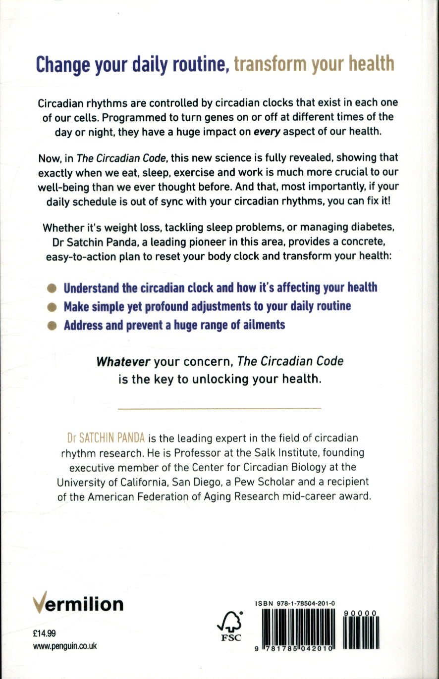 Programmed to turn genes on or off at different times of the day or night, they influence every aspect of our health from weight and energy levels through to resistance to disease and infection, and how well we sleep. Now, in The Circadian Code, this new science is revealed, showing that the timings of our day (when we eat, sleep, exercise, work) are more crucial than we ever thought before. And that, most importantly, if your daily schedule is out of sync with your circadian rhythms, you can fix it!Whether you are a shift worker, a frustrated dieter, someone suffering from sleep problems or chronic illness, whatever your health concern, The Circadian Code is the key to unlocking your health.