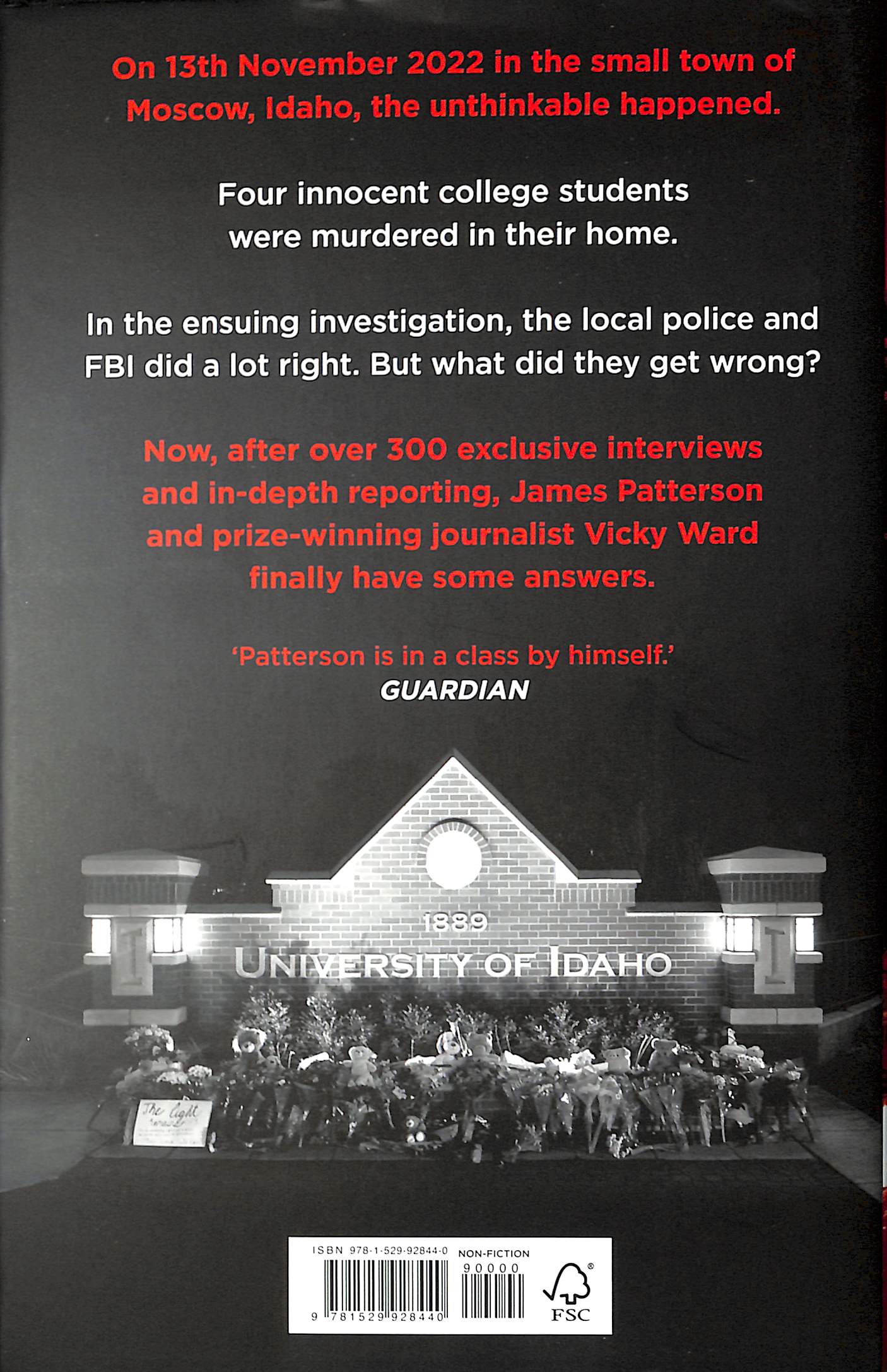 Go behind the headlines with the gripping new true crime book from a bestselling author and an award-winning journalist, offering unprecedented insight into the 2022 Idaho murders and the subsequent arrest of Bryan Kohberger. THE INSTANT SUNDAY TIMES BESTSELLER"A disturbing, necessary portrait of a killer and his victims... a mesmerizing read and a great detective story, yet sadly all true." THE GUARDIAN _________________________________If you were hooked by Amazon's new docuseries One Night in Idaho, read the full story here... _________________________________On 13th November 2022 in the small quiet town of Moscow, Idaho, the unthinkable happened. Four innocent college students were murdered in their home. In the ensuing investigation, the local police and FBI did a lot right. But what did they get wrong?We’ve learned about the four heartbroken families – the Mogens, Goncalves, Kernodles, and Chapins. We have the backstory for Bryan Kohberger, brilliant graduate student, loner, apparent incel. Now, after over 300 exclusive interviews and in-depth reporting, bestselling crime writer James Patterson and award-winning investigative journalist Vicky Ward finally have some answers. Published in the US as THE IDAHO FOUR. _________________________________Praise for James Patterson'The master storyteller of our times' HILLARY RODHAM CLINTON'Nobody does it better.' JEFFERY DEAVER, author of bestselling crime novel, The Bone Collector'No one gets this big without amazing natural storytelling talent - which is what Jim has, in spades.' LEE CHILD, bestselling author of the Jack Reacher series‘Patterson is in a class by himself’ GUARDIAN
