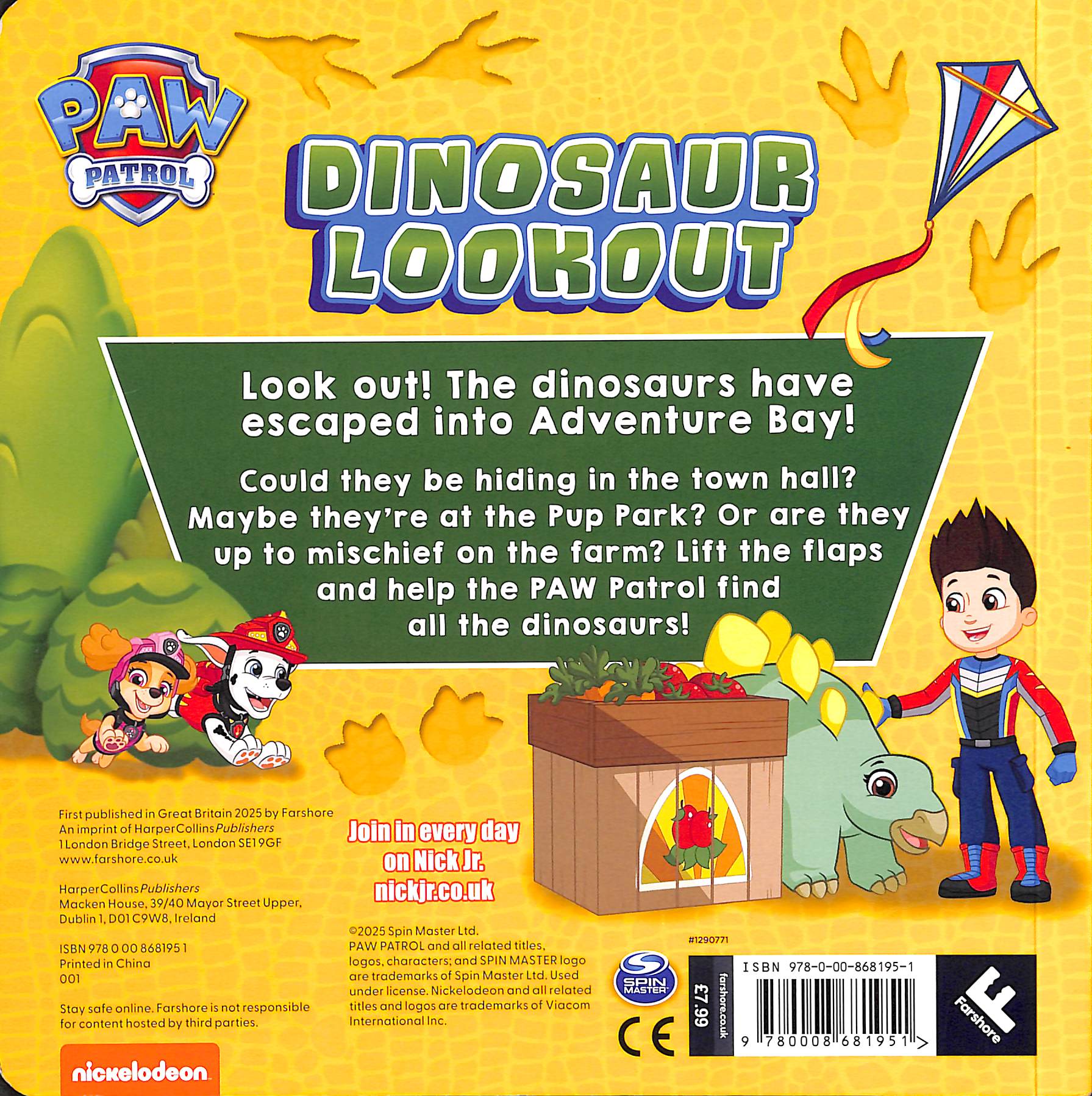 There are plenty of fun things to search for and discover under the flaps, and favourite characters waiting to say hello. Along with extra things to count on each page, PAW Patrol Dinosaur Lookout is perfect for young PAW Patrol fans! Discover more PAW-some adventures: PAW Patrol Search and Rescue Pups: A Lift-the-Flap Book PAW Patrol Hide and Seek: A Search and Find Book PAW Patrol Jigsaw Book PAW Patrol Dinosaur Sticker Activity Book PAW Patrol Dinosaur Rescue Picture Book PAW Patrol Dinosaur Birthday Board Book PAW Patrol Aqua Pups Board Book PAW Patrol Mighty Pups Board Book