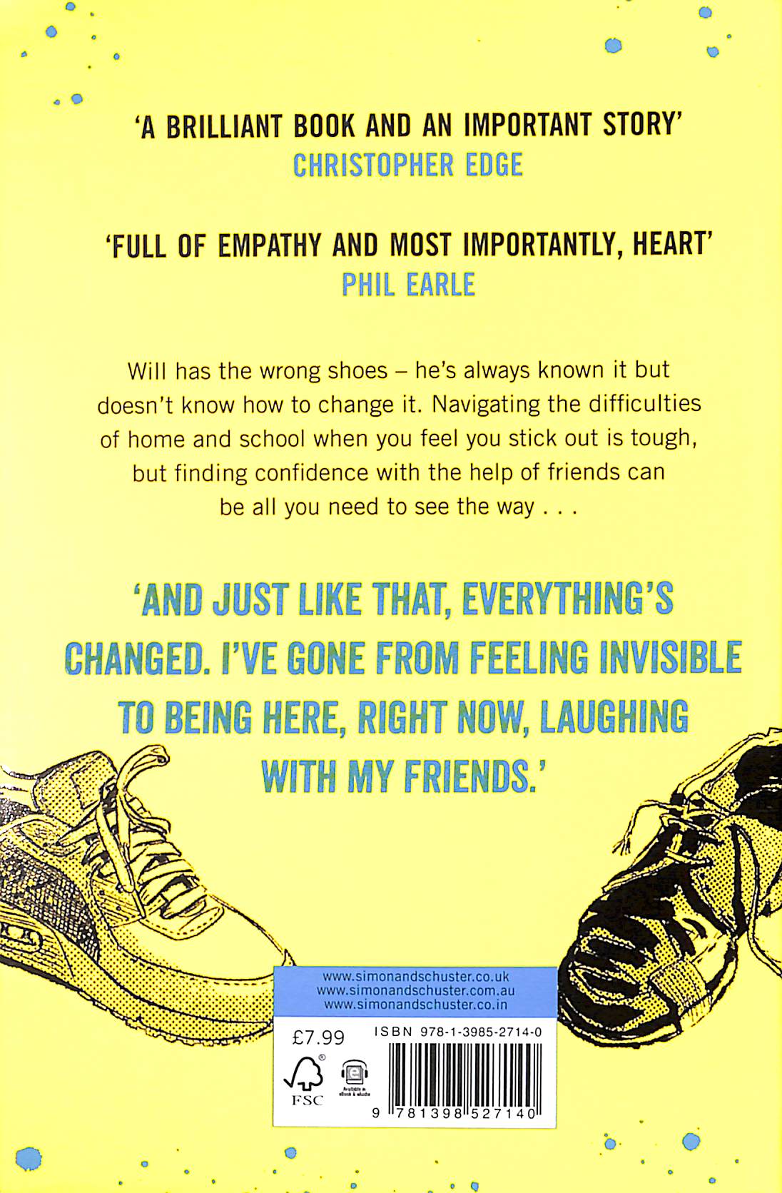 Navigating the difficulties of home and school when you feel you stick out is tough, but finding confidence with the help and empathy of friends can be all you need to see the way.  Praise for The Wrong Shoes: ‘An extraordinary, powerful and moving book that has the potential to change lives.’ Hannah Gold ‘Every chapter is full of experience & empathy & most importantly, heart’ Phil Earle ‘Reading fiction is about walking in the shoes of people whose lives are very different to ours and allowing more readers to see themselves in stories.