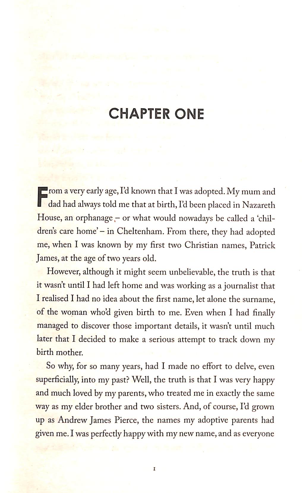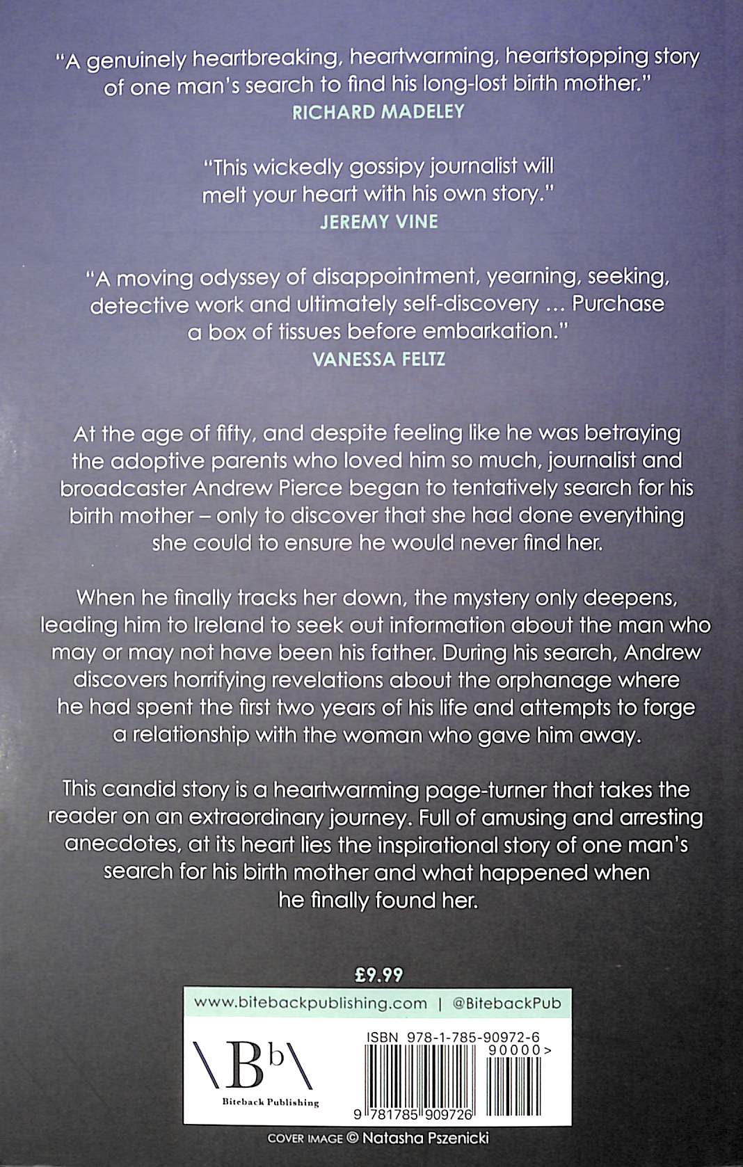 Atthe age of fifty, and despite feeling like he was betraying the adoptiveparents who loved him so much, journalist and broadcaster Andrew Pierce beganto tentatively search for his birth mother - only to discover that she had doneeverything she could to ensure he would never find her. Whenhe finally tracks her down, the mystery only deepens, leading him to Ireland toseek out information about the man who may or may not have been his father. During his search, Andrew discovers horrifying revelations about the orphanagewhere he had spent the first two years of his life and attempts to forge arelationship with the woman who gave him away. Thiscandid story is a heartwarming page-turner that takes the reader on anextraordinary journey.