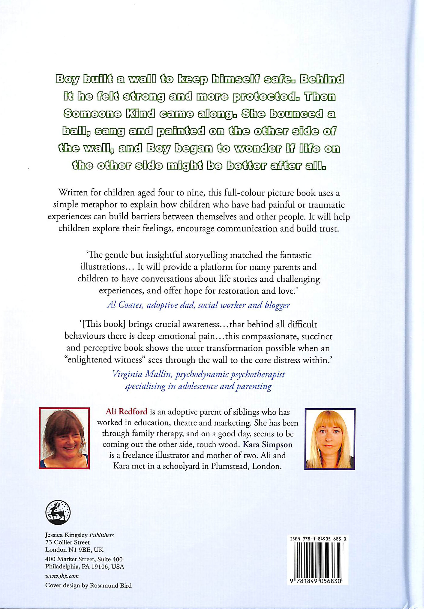 Boy built a wall to keep himself safe. Behind it he felt strong and more protected. Then Someone Kind came along. She bounced a ball, sang and painted on the other side of the wall, and Boy began to wonder if life on the other side might be better after all. Written for children aged 4 to 9, this gentle full-colour picture book uses a simple metaphor to explain how children who have had painful or traumatic experiences can build barriers between themselves and other people.