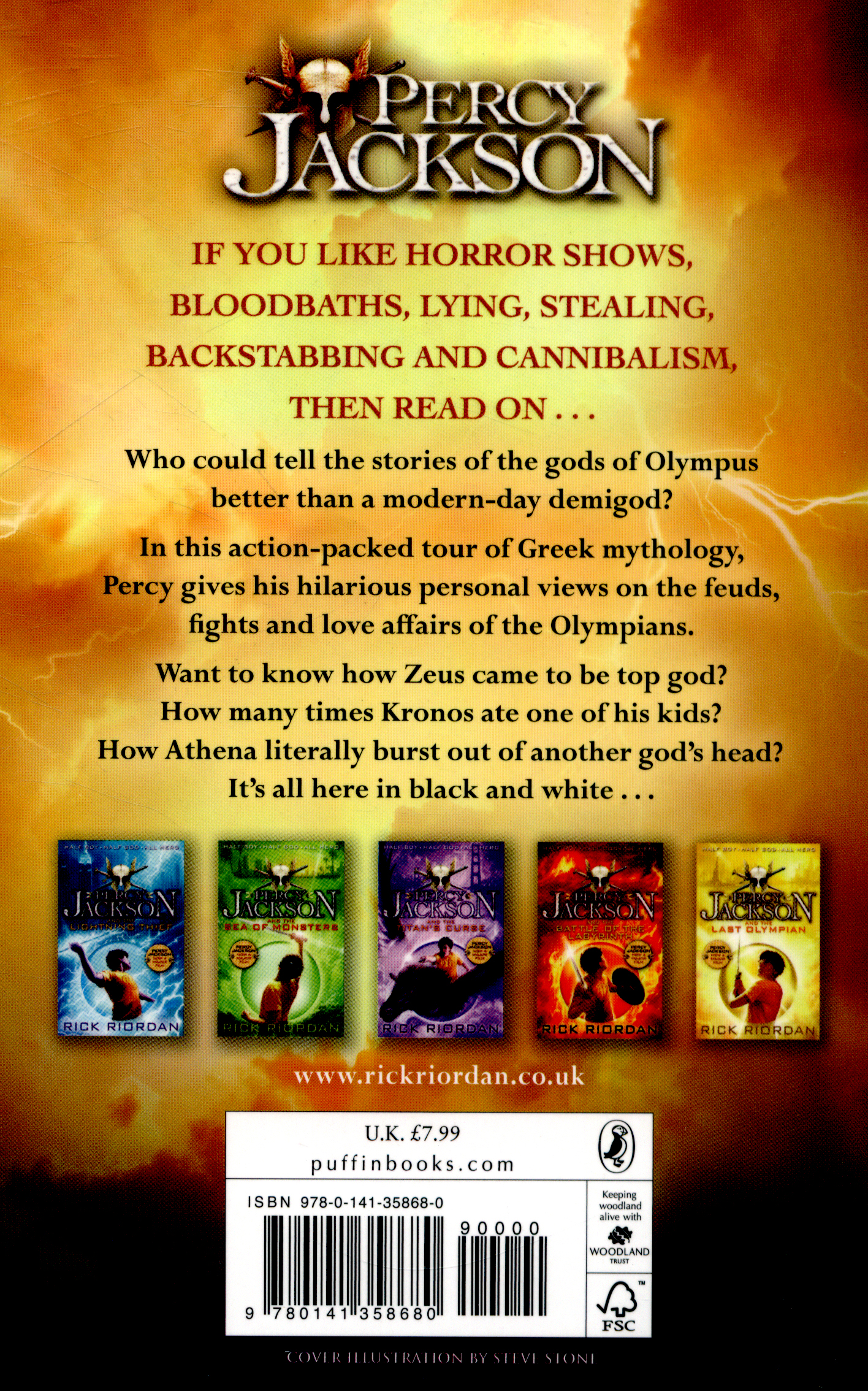 "If you like horror shows, bloodbaths, lying, stealing, backstabbing and cannibalism, then read on..." Who could tell the true stories of the gods and goddesses of Olympus better than modern-day demigod Percy Jackson?In this action-packed tour of Greek mythology, Percy gives his hilarious personal views on the feuds, fights and love affairs of the Olympians.