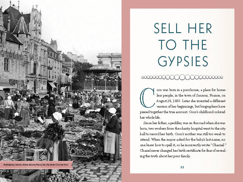 Coco Chanel focuses on the obstacles Chanel faced as a financially independent woman in an era when women were expected to marry; as well as her fierce competition with the Italian fashion designer Elsa Schiaparelli; and some of her most memorable firsts for the fashion industry, including the little black dress, the quilted purse with gold chain, and the perfume Chanel No. 5. The book includes a bibliography, a list of where to see her work, and an index.