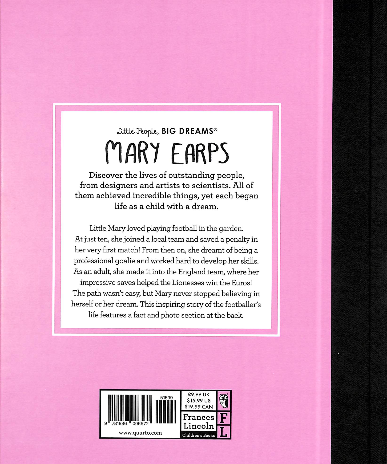 Little People, BIG DREAMS Mary Earps features:Quirky and stylish illustrationsA biographical timeline, complete with historical photos and a detailed profile Recommendations for further readingLittle People, BIG DREAMS is the bestselling biography series for kids that explores the lives of outstanding people, from designers and artists to scientists and activists.
