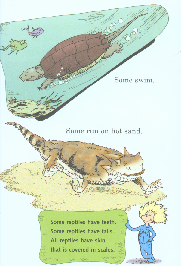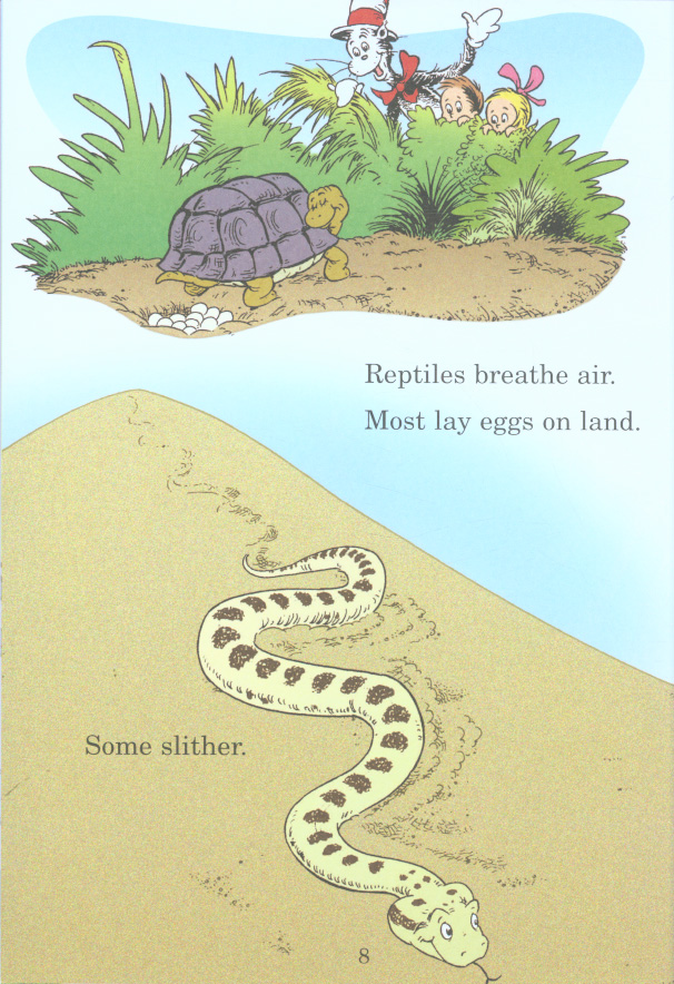 There are thousands of reptiles. I’ll show some to you. Your mother will notmind at all if I do. Join the Cat in the Hat as he introduces beginning readers to reptiles. This title and others form part of a series of books that takes an off-beat look at nature and natural sciences through a fun combination of Seussian rhymes and zany illustrations.