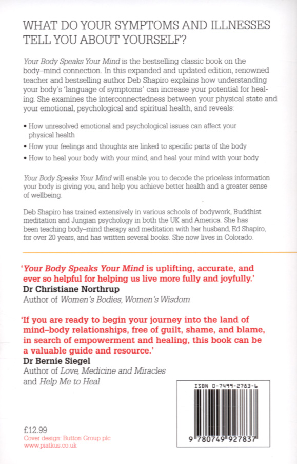 In "Your Body Speaks Your Mind", renowned teacher and bestselling author Deb Shapiro shows how understanding your body's 'language of symptoms' can increase your potential for healing.