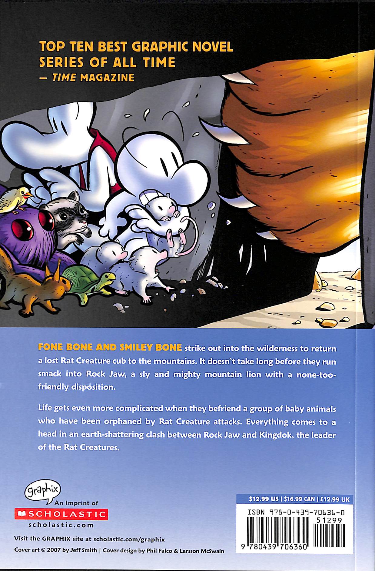 It doesn't take long before they run smack into Rock Jaw, a sly and mighty mountain lion with a none-too-friendly disposition. Life gets even more complicated when they befriend a group of baby animals who have been orphaned by Rat Creature attacks. Everything comes to a head in an earth-shattering clash between Rock Jaw and Kingdok, the leader of the Rat Creatures. The fifth book in a wonderfully thrilling adventure series Authored by New York Times and USA Today bestselling, award-winning author, Jeff Smith One of the most popular graphic novel series of all time