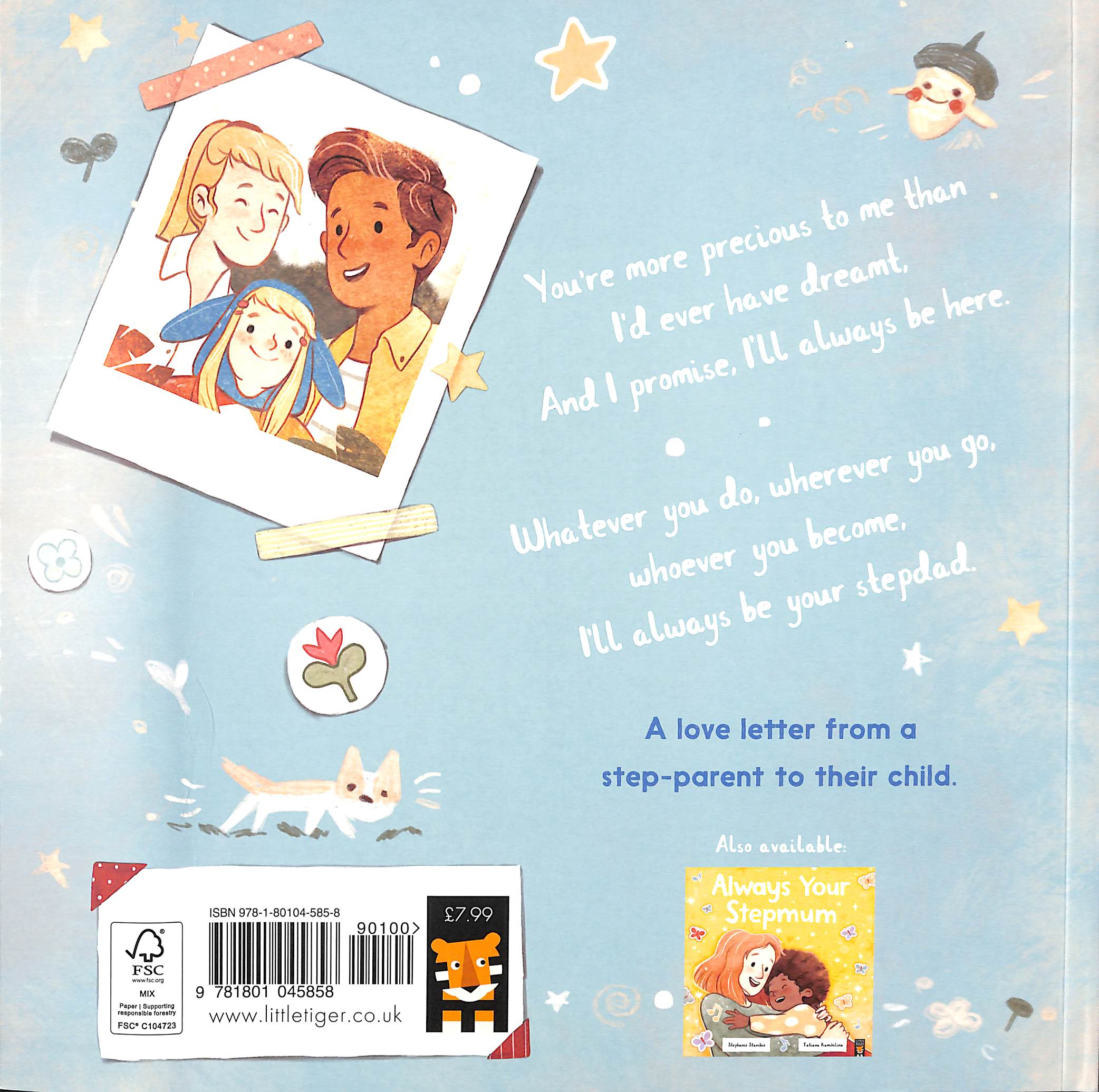 A heartfelt celebration of the unconditional love between a stepparent and their child, written by Stephanie Stansbie and illustrated by Tatiana Kamshilina. All those times . . . dressing up, playing cards, watching films, how I cheered you up when you felt sad. And that beautiful moment, I'll never forget,When I truly felt I was your . . . DAD!This lyrical love letter of a book explores the unique challenges, joys and experiences of becoming a blended family.