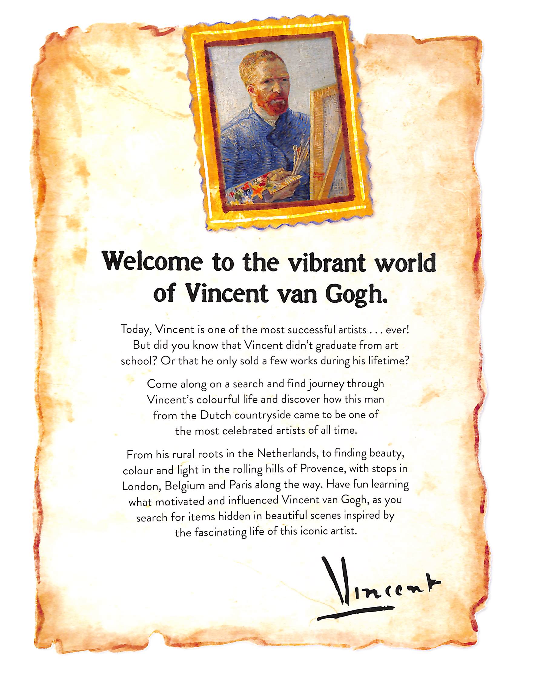 Take a search and find journey through the colourful life of Vincent van Gogh.