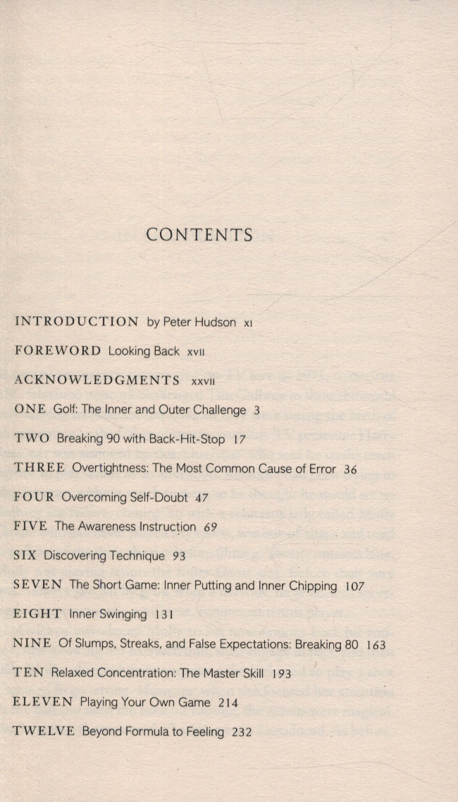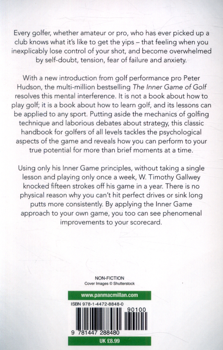 How to improve your game and discover your true potential by increasing your concentration, willpower and confidence Every golfer, whether amateur or pro, who has ever picked up a club knows what it's like to get the yips - that feeling when you inexplicably lose control of your shot, and become overwhelmed by self-doubt, tension, fear of failure and anxiety. With a new introduction from golf performance pro Peter Hudson, the multi-million bestselling The Inner Game of Golf resolves this mental interference.