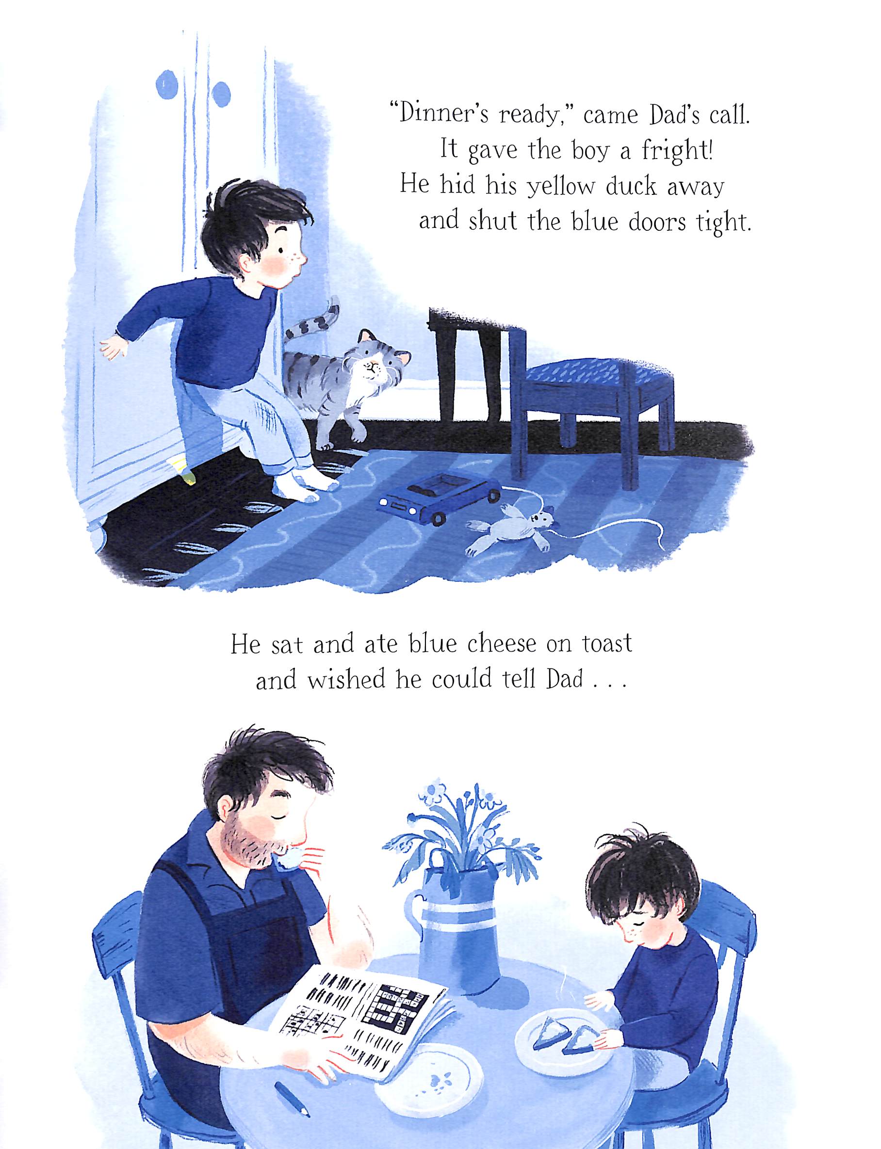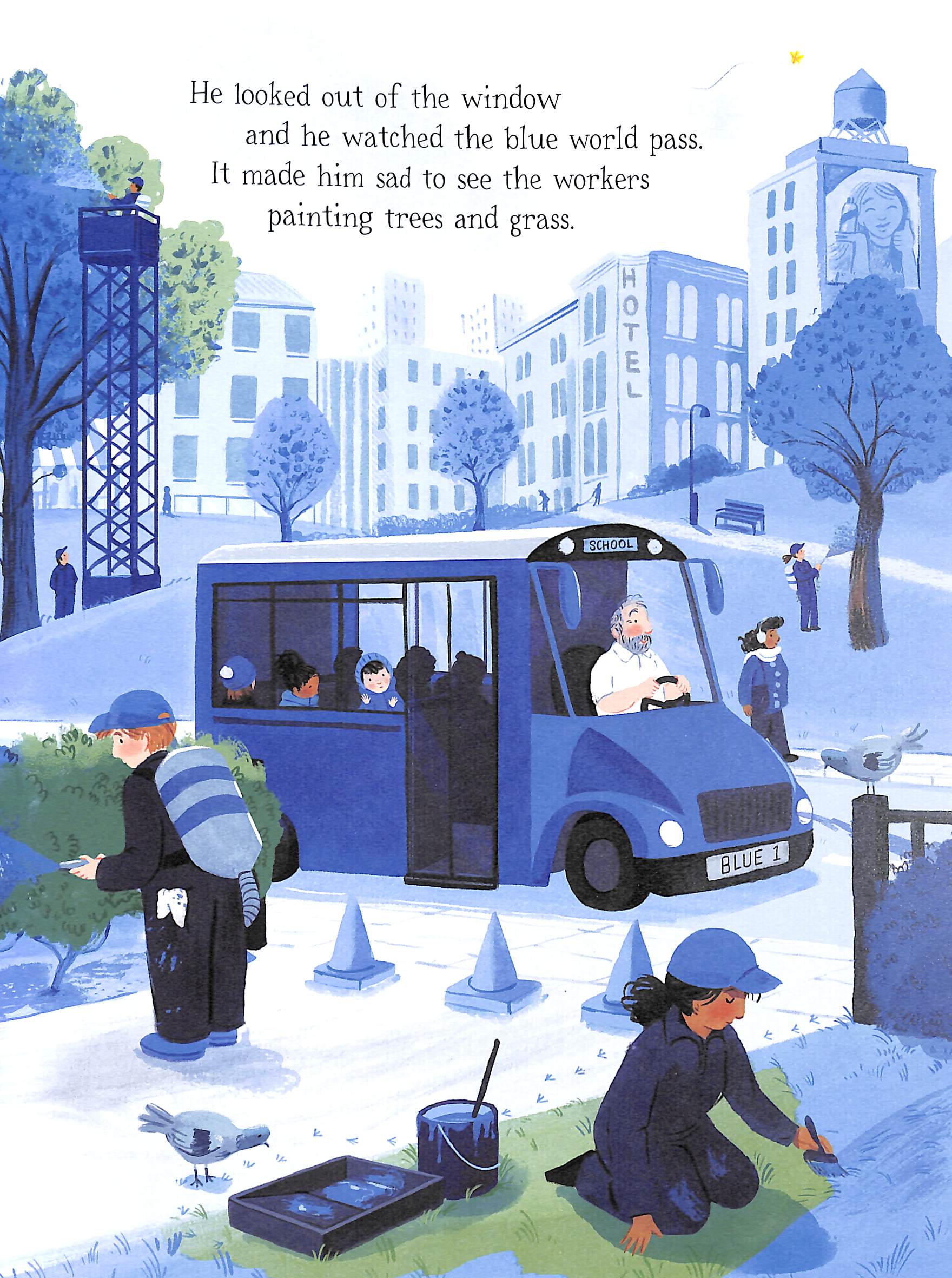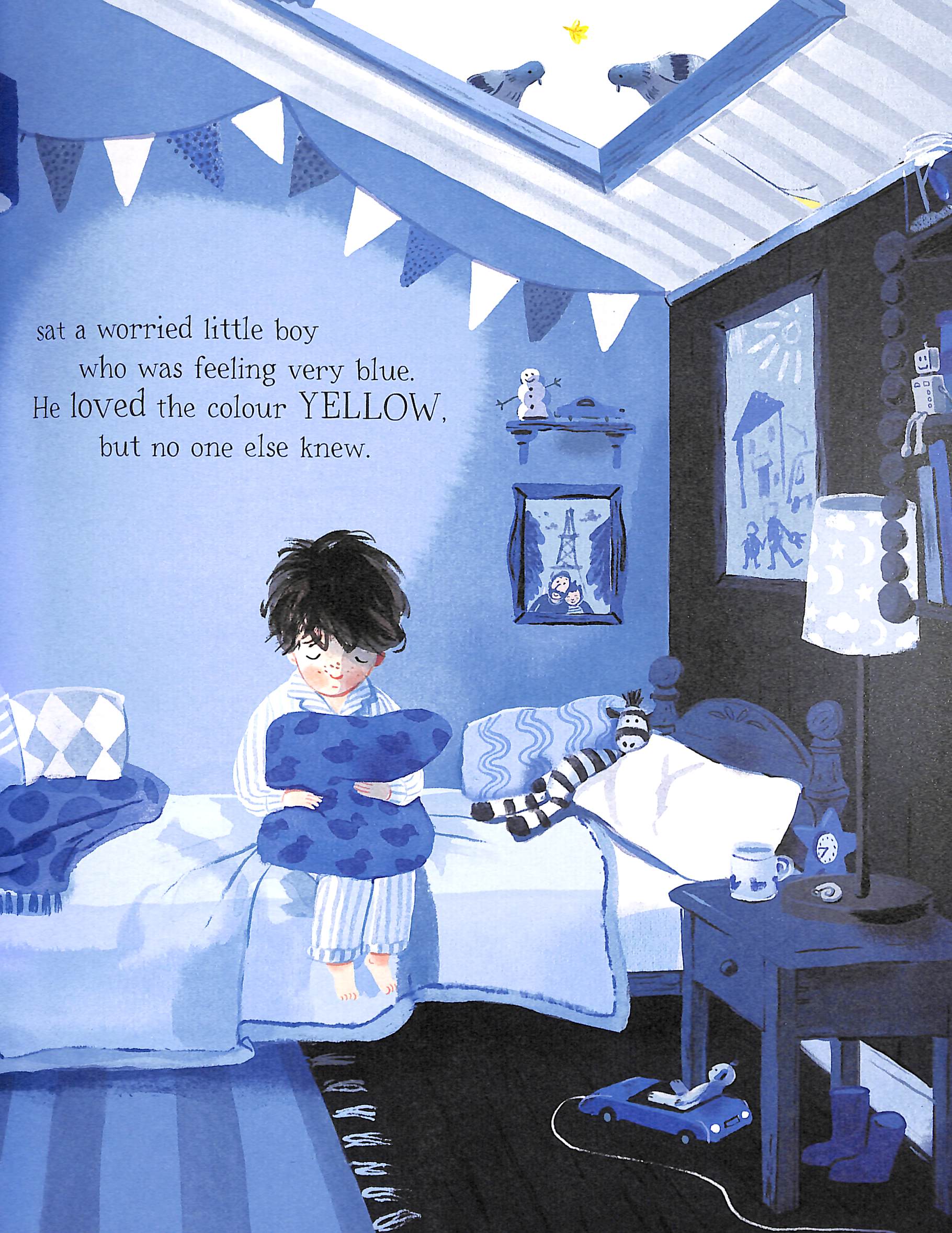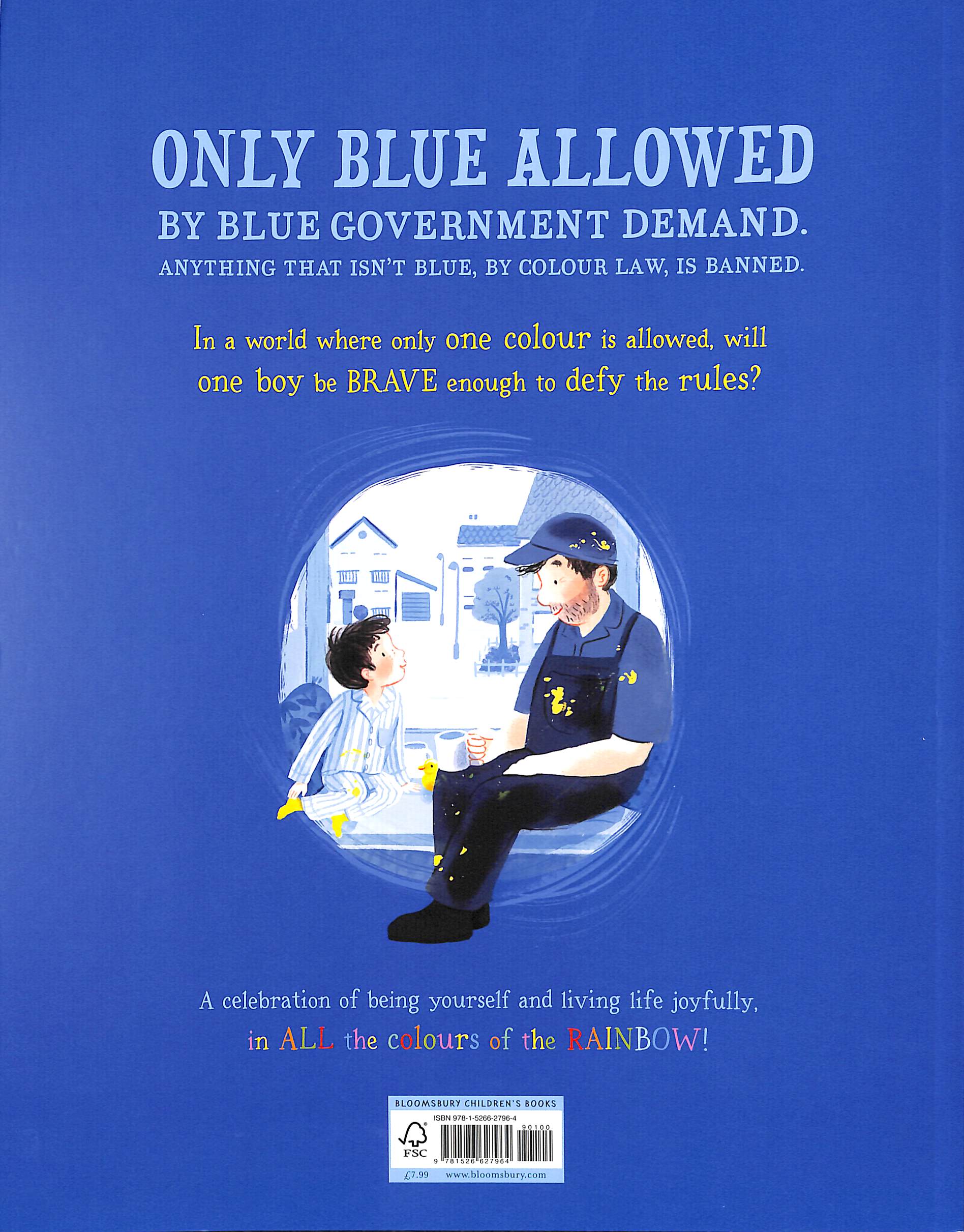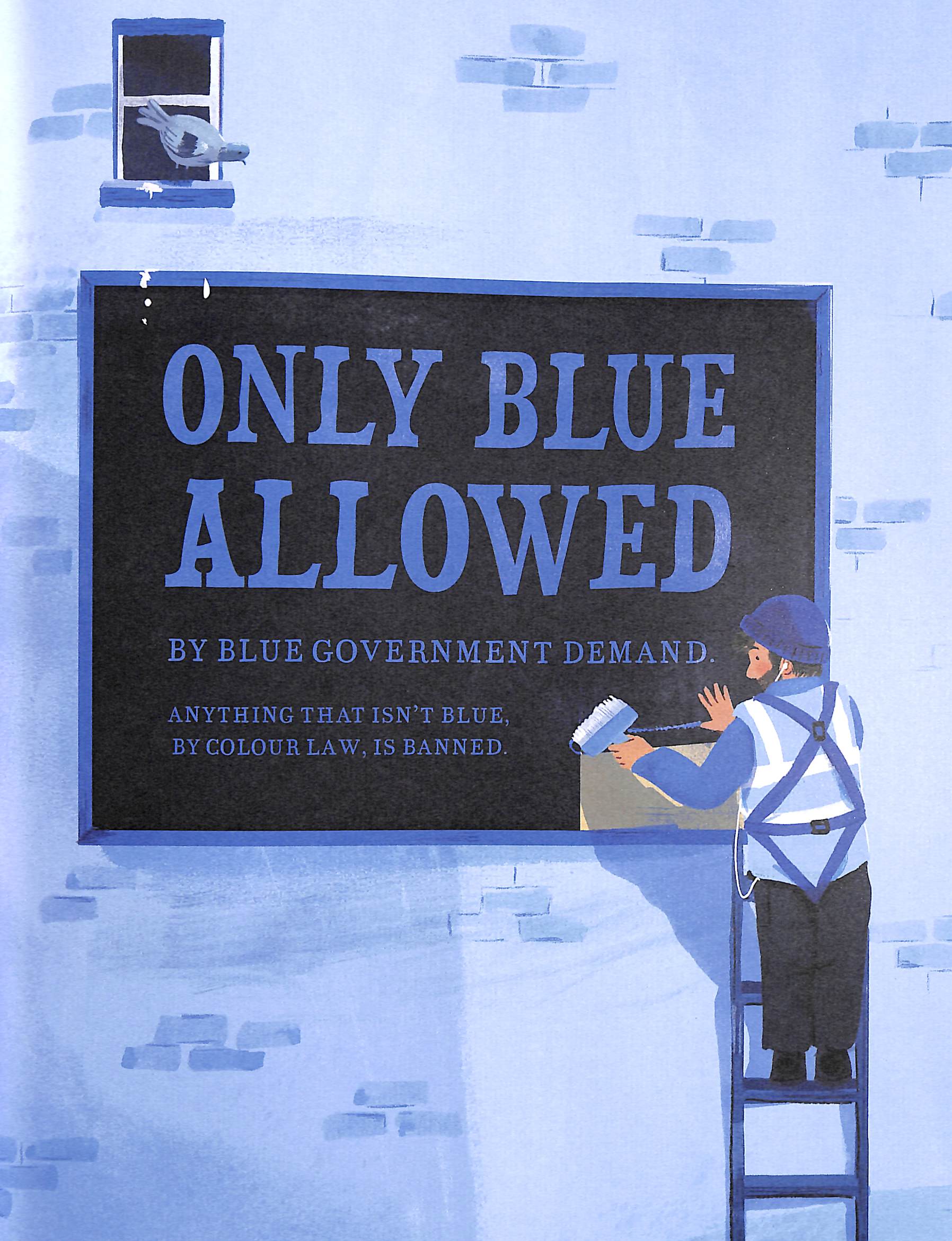 ONLY BLUE ALLOWED, by Blue government demand. Anything that isn't blue, by colour law, is banned. In a very blue house on a very blue street, sits a little boy who feels as blue as the world around him.