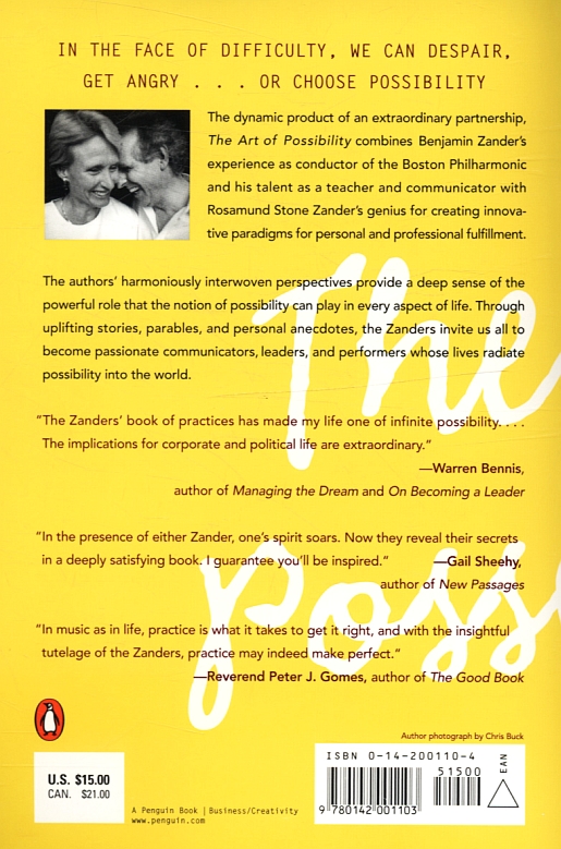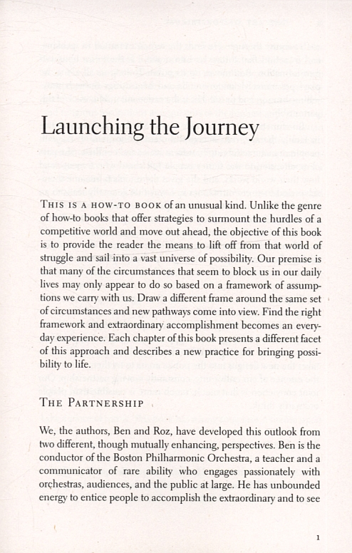 Presenting twelve breakthrough practices for bringing creativity into all human endeavors, "The Art of Possibility" is the dynamic product of an extraordinary partnership. "The Art of Possibility" combines Benjamin Zander's experience as conductor of the Boston Philharmonic and his talent as a teacher and communicator with psychotherapist Rosamund Stone Zander's genius for designing innovative paradigms for personal and professional fulfillment.